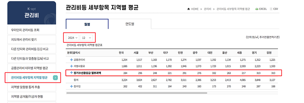 기준월을 12월로 변경하면 각 지역별로 평균장기수선충당금 금액을 확인할 수 있습니다.