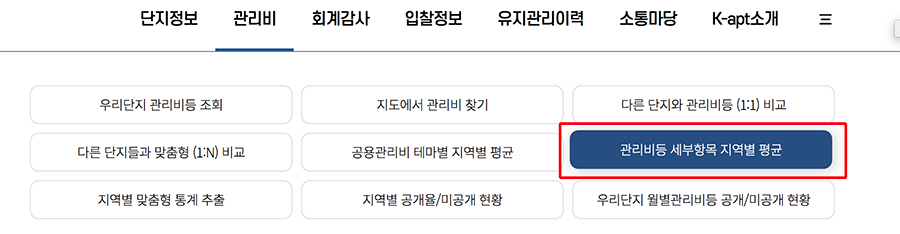 사이트에 접속 후 상단 관리비 탭에서 [관리비등 세부항목 지역별 평균]을 선택합니다.