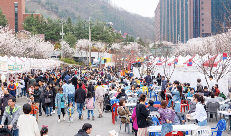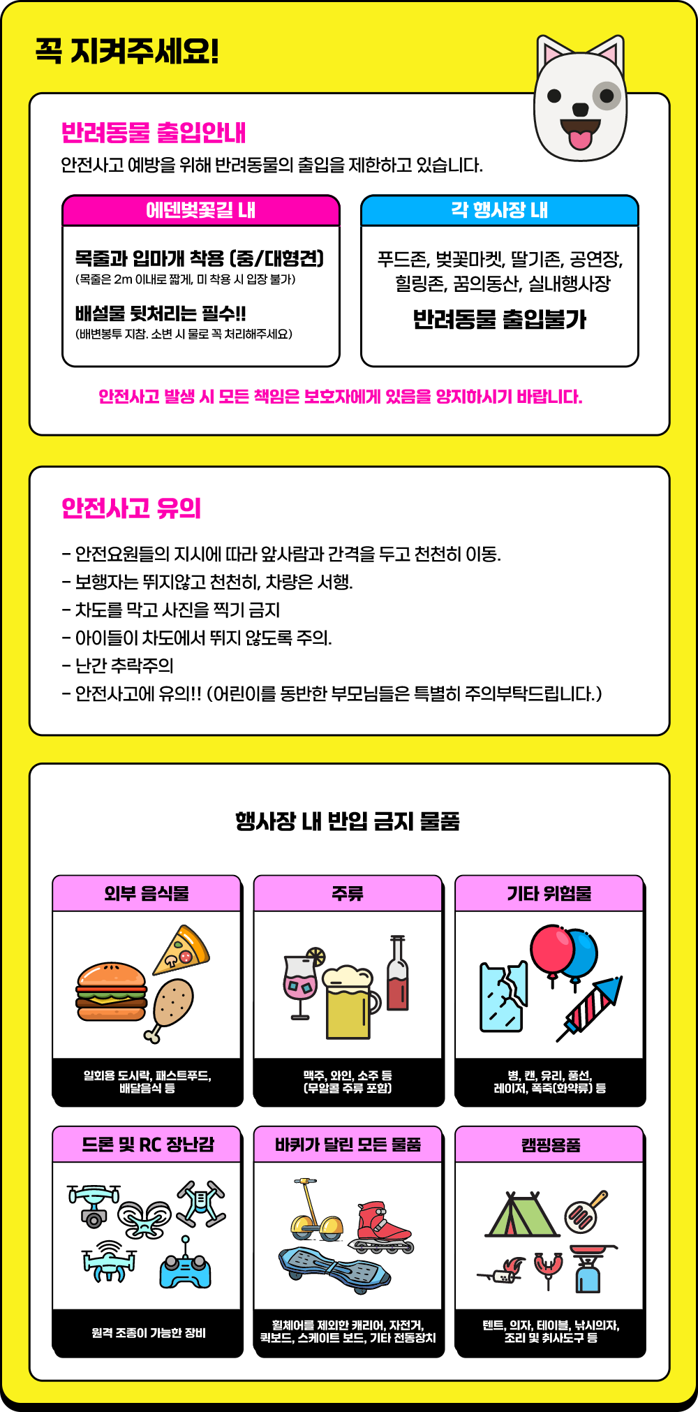 - 푸드존, 벚꽃마켓, 딸기존, 공연장, 힐링존, 꿈의동산, 실내행사장